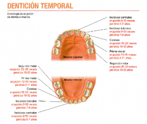 Los dientes de leche(temporales o infantiles) son los primeros en aparecer. Los Primeros aparecen a los 6 meses y los últimos a los 24 meses de edad. Son 20 piezas dentales, 10 en cada arcada. Son muy importantes para desarrollar un habla inteligible, para masticar y desarrollar una estructura facial y mandibular normal. Debido a esto, importantísimo cuidarlos.